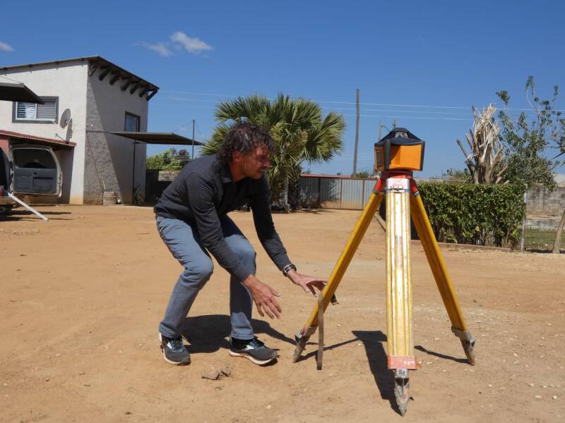 Er bleek zowaar een heuse laser aanwezig te zijn op onze basis om mee te kunnen landmeten. Een mooie kans om zelf het terrein in te kunnen meten, zoals 30 jaar geleden op school geleerd 😄